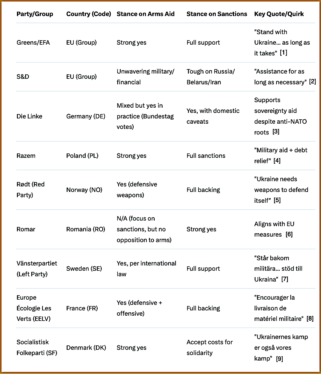 Vänsterpartiet (Suecia) y Rødt (Noruega) también abandonaron en algún momento su postura “neutral”; ahora apoyan la ayuda militar a Ucrania.